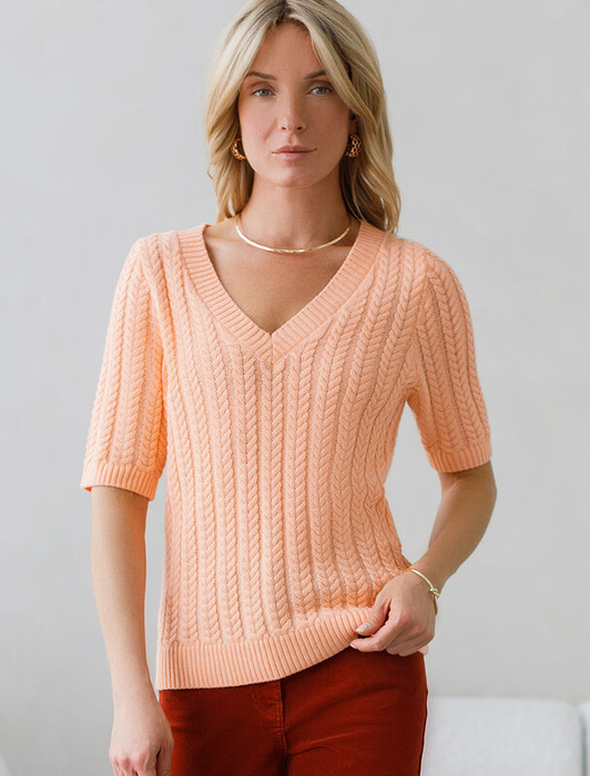 Джемпер фактурной вязки выполнен из хлопка с добавлением кашемира. Модель с V-вырезом с вывязанным орнаментом цепи. Мягкая и очень приятная пряжа совершенно не колется, сохраняет тепло при этом не перегревая, гарантируя безупречный комфорт.