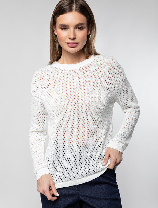 Джемпер связан фактурным узором из пряжи на основе крученой вискозы с лиоцеллом. Изделие, получилось плотное но достаточно легкое, приятно ощущается на теле, поэтому в нем будет комфортно даже в жаркое время года. Можно носить с бежевым бельем или хлопковым топом.