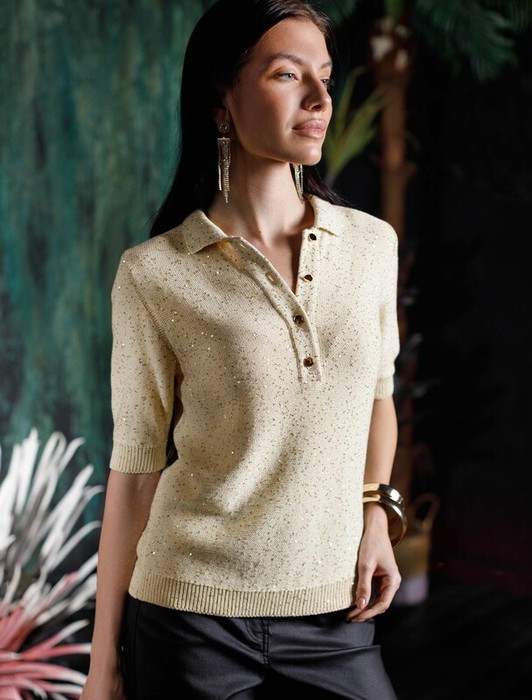 Легкий джемпер поло черного цвета с коротким руковом выполнен из хлопковой пряжи с вкраплением сияющих пайеток, что придает особую изысканность. Стильный джемпер связан изнанкой, пряжа отличается легкостью и приятной текстурой, совершенно не колется, обеспечивает комфорт даже при длительном использовании, а натуральные волокна поддерживают оптимальный температурный баланс. Крой полуприлегающий, подчеркивает женственный силуэт, а отложной воротничок с застежкой на золотистые пуговицы и манжеты на рукавах гармонично завершают дизайн, создающий аккуратный образ.  Нарядный джемпер подойдет девушкам и женщинам больших размеров, в нем вы будете чувствовать себя уверенно и свободно в любой ситуации. Мерцающий эффект пайеток добавляет образу выразительности и индивудуальности. Сочетайте джемпер в  романтическом образе с пышной юбкой, в более строгом с широкими брюками.  С этим поло легко создать премиальный лук в стиле old money. Мерцающее полотно добавляет особого шарма вашему образу, делая его уместным как на празд