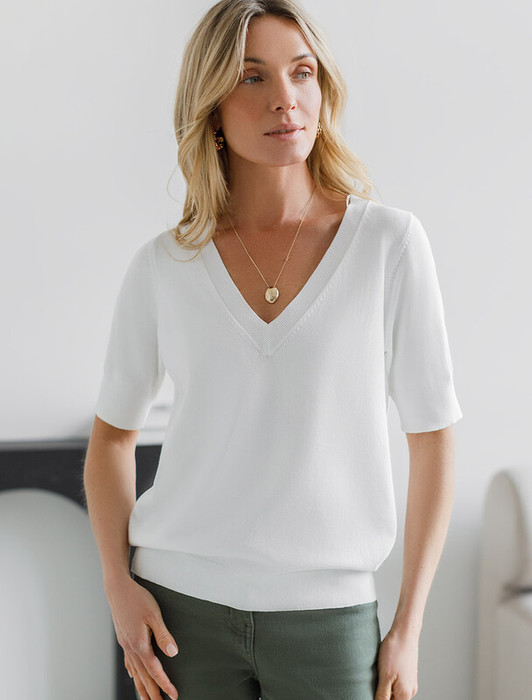 Совместные покупки Уфа Женская одежда Джемперы, свитеры, водолазки — Vilatte Джемпер тонкой вязки из вискозы с нейлоном D39.355 натуральный белый
