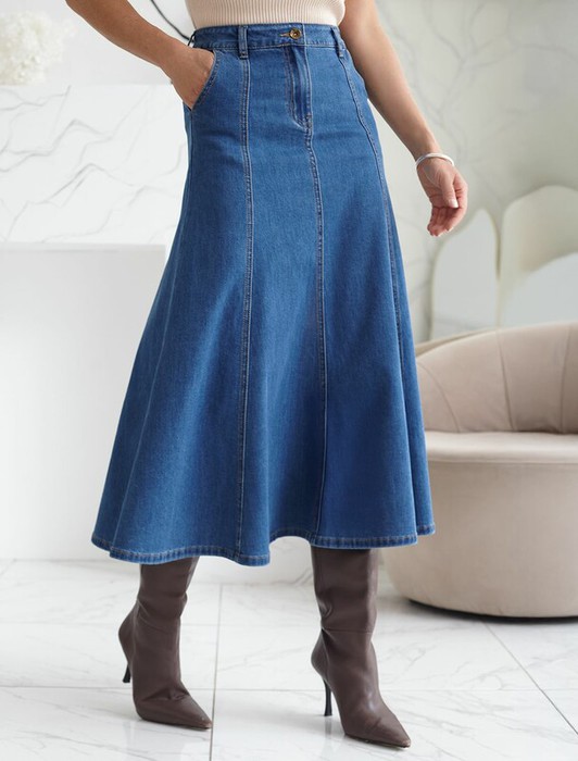 27.03 Vilatte Джинсовая юбка миди А силуэта с декоративными швами из эластичног
