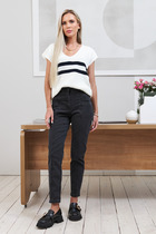 В синем цвете ткань немного толще, чем голубой и черный цвета. Свободные штанины вверху, заужаются к низу, делая силуэт стройнее, открывая нижнюю часть лодыжки.