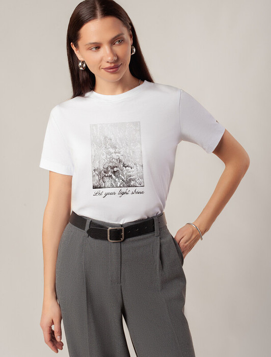 Футболка выполнена из премиального хлопка.Принт "леопард" нанесен фактурными красками с устойчивым покрытием. Наличие эластана в составе гарантирует комфорт и формоустойчивость. Изделие дополнено фирменным металлическим логотипом бренда.