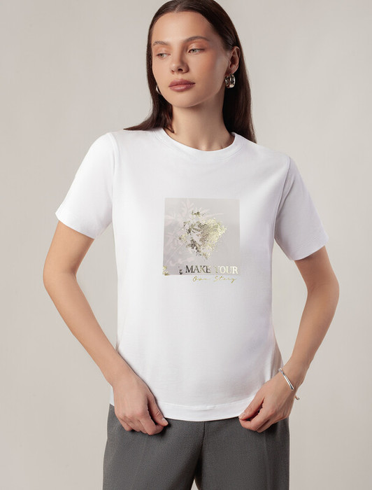 Совместные покупки Уфа Женская одежда Футболки — Vilatte Футболка из премиального хлопка с авторским принтом D49.110 белый_own st