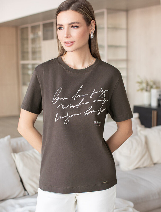 Совместные покупки Уфа Женская одежда Футболки — Vilatte Футболка из премиального хлопка с авторским принтом D49.983 кофе_be diff