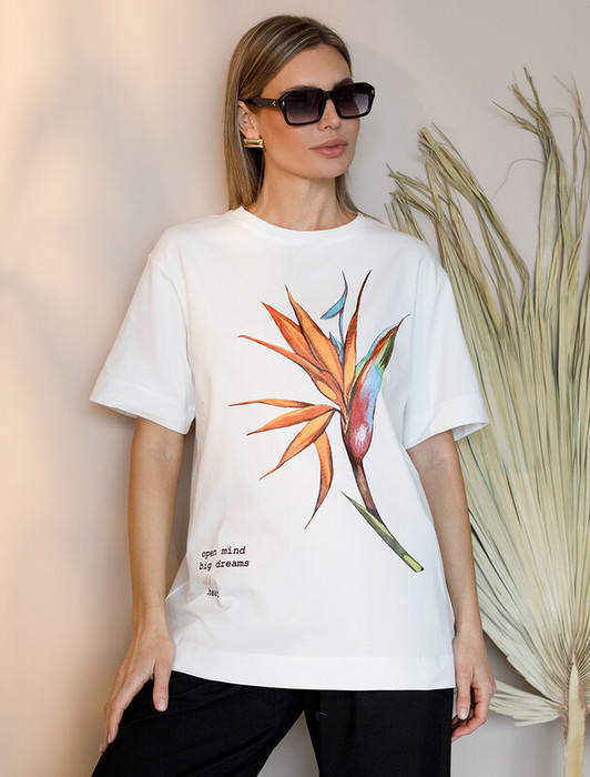 Совместные покупки Уфа Женская одежда Футболки — Vilatte Футболка из премиального хлопка с авторским принтом фольгой D49.978 бел