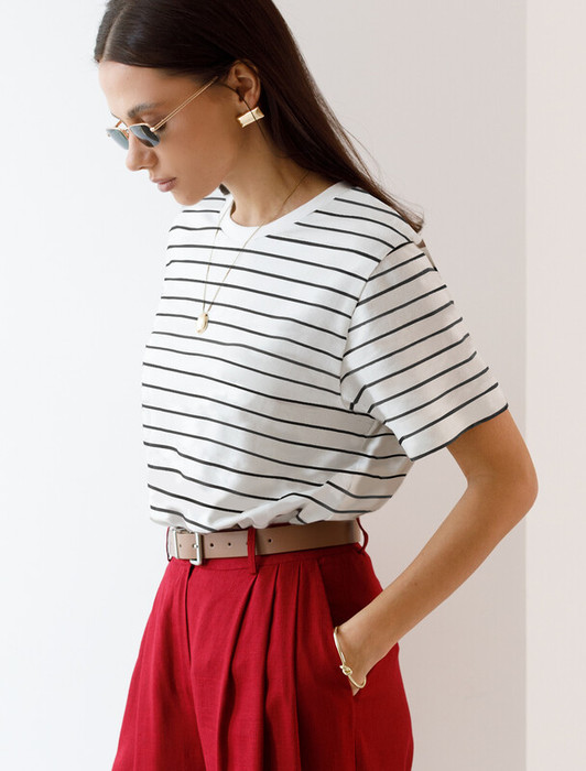Футболка выполнена из премиального хлопка. Наличие эластана гарантирует абсолютный комфорт и долговечность изделия. Модель в полоску предлагаем сочетать с однотонными вещами базовой палитры. Изделие дополнено металлическим логотипом бренда.