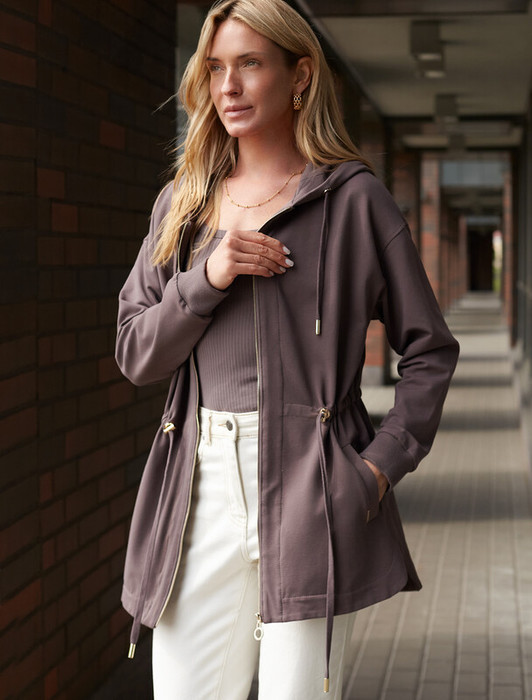 Парка выполнена из эластичного футера двухнитки. Модель дополнена золотистой фурнитурой высокого качества с логотипом бренда. Как у классической модели, изделие с капюшоном, боковыми карманами и регулируемым поясом на хлопковом шнурке. Сочетается в костюме с брюками D44.136, D44.137 и юбкой D46.034