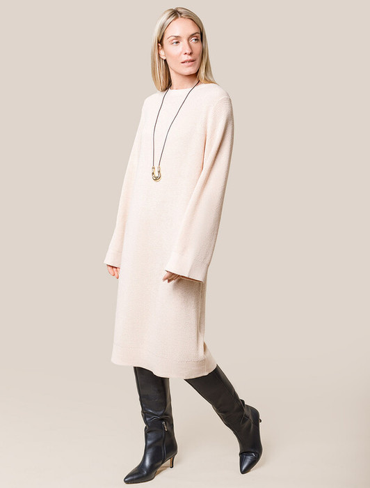 Платье прямого силуэта фактурной вязки выполнено из хлопка с добавлением кашемира.