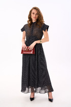 Элегантное платье прямого кроя черного цвета выполнено из воздушной сетчатой ткани с прозрачными рукавами, придающими образу лёгкую игривость. Мягкая вискозная подкладка обеспечивает комфорт, сохраняя при этом эффект полупрозрачности. Универсальный черный цвет делает платье идеальным для базового гардероба.