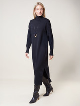 Платье тонкой вязки выполнено из хлопка. Лаконичная модель с высоким воротом дополнена манжетами и разрезами по бокам. Изделие свободно сидит по фигуре и не сковывает движений. Мягкая пряжа очень приятная к телу не колется и сохраняет тепло при этом не перегревая. Изделие дополнено металлическим логотипом бренда.
