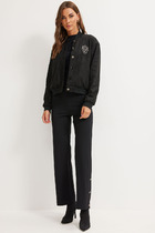 Брюки выполнены из футера двухнитки с эластаном. Модель прямого кроя дополнена боковыми карманами и одним задним карманом.  Пояс выполнен из эластичного трикотажа в рубчик. В пояс вставлен плоский хлопковый шнур в тон изделия с серебристыми наконечниками. Изделие дополнено металлическим логотипом бренда. Сочетается в костюме с жакетом D49.078, джемпером D49.079, D49.080 и футболкой D49.081