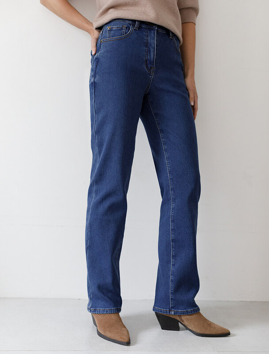 Прямые джинсы выполнены из эластичного денима плотностью 17 oz. Удлиненная модель синего цвета с контрастными строчками. Комфортная посадка на талии подходит для любой фигуры, ткань хорошо тянется и не сковывает движений. На поясе сзади расположен нашивка из эко-кожи с логотипом бренда. Длина изделия позволяет выбрать к образу обувь на каблуке