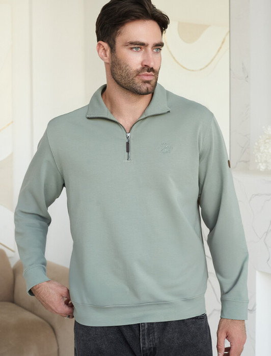 Уютный и стильный свитшот светло-оливкого цвета с воротом-стойкой на молнии - идеальный выбор для повседневного образа. Выполнен из премиального футера двухнитки с эластаном, Изнаночная сторона невероятно мягкая, что делает материал особенно приятным к телу.  Благодаря эластичной структуре ткань хорошо тянется, сохраняет форму после длительной носки и обеспечивает свободу движений даже в самых активных буднях, а натуральный состав обеспечивает отличную воздухопррницаемость, позволяя коже дышать и не перегреваться.