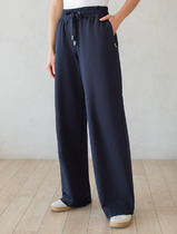 Брюки свободного кроя выполнены из эластичного футера-двухнитки. Модель дополнена защипами и боковыми карманами как у классических брюк и одним задним карманом. Эластичный пояс на резинке с шнурком из репсовой ленты и металлической фурнитурой. Брюки сочетаются в костюме с футболкой D49.031, D49.085, бомбером D49.038 и паркой D49.075