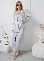 Юбка выполнена из вискозы с лиоцеллом. Модель А-силуэта кроенная по косой. Ткань изящно блестит и приятно охлаждает кожу в жаркое время года. Модель сечетается в костюме с топом D23.062 и блузкой D29.263