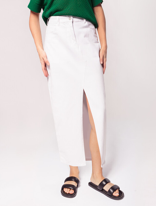 Длинная белая юбка выполнена из мягкого эластичного денима. Трендовый высокий разрез спереди добавляет чувственный характер лаконичному изделию и не сковывает шаг при ходьбе. Универсальный белый цвет сочетается с любым верхом. Подходит для любой фигуры.