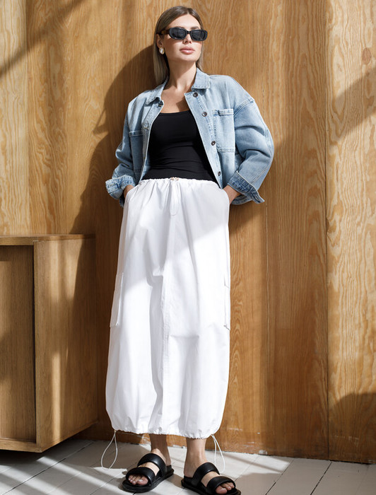 Трендовая юбка «карго» с поясом на резинке выполнена из плотного поплина. Низ изделия сделан на кулиске, что позволяет регулировать форму, используя платье по-разному в зависимости от образа. Материал прочный и износостойкий, но при этом мягкий и удобный, отлично подходит для повседневной носки, гарантируя абсолютный комфорт. Модель дополнена боковыми и двумя накладными карманами.