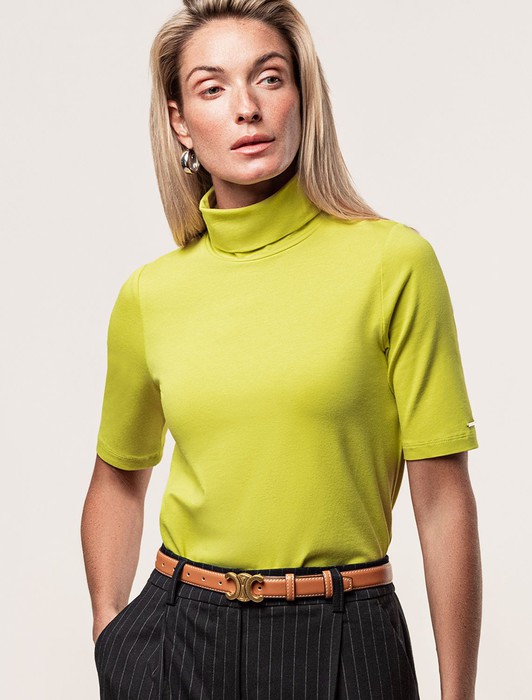 Состав: 92%Хлопок 8%ПУ Параметры модели на первом фото: Рост 172, бюст 88, талия 64, бедра 88Лаймовая водолазка с коротким рукавом выполнена из премиального хлопка с добавлением эластичных волокон. Гладкий трикотаж обеспечит гарантированный комфорт и удобство в использовании. На рукаве изделия металлическая нашивка с логотипом бренда. Совет стилиста: водолазку с коротким удобно сочетать с жакетом или блузкой. Также как самостоятельный верх к широким брюкам.
