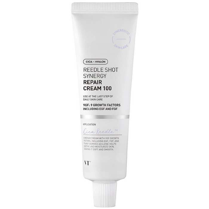 Крем VT Cosmetics Reedle Shot Synergy Repair Cream 100 восстанавливает раздражённую кожу, запускает регенерацию повреждений после использования кислот, ретинола, микроигл и других активов.