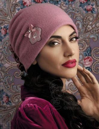 Элегантная женская шапка-бандана с драпировкой сзади и нарядной декоративной композицией из основного полотна с отстрочками шелковой нитью по кромкам. Сбоку – фирменная аппликация из шелка со стразами и маленький шелковый бантик с ювелирным стразом в центре.