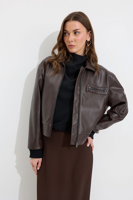 Описание Жакет прямого силуэта из экокожи. Воротник отложной, по центру застежка на молнию. Жакет с удлиненной линией плеча, рукав одношовный втачной, по низу рукава манжета (из трикотажного полотна). По переду рельефы с функциональными карманами и декоративный элемент с молнией. На спинке кокетка. По низу жакета притачной пояс (из трикотажного полотна). Жакет на подкладке. Обращаем ваше внимание, что фурнитура может отличаться от фото