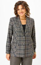 Жакет прямого силуэта, выполнен из однотонной ткани, жакет на подкладке. Полочка жакета с центральной застежкой на петлю пуговицу. Полочка с вертикальными рельефами и прорезными карманами с клапанами. Горловина V-образной формы с отложными лацканами и воротником пиджачного типа. Спинка со средним швом и вертикальными рельефами. Рукав втачной, двухшовный. Жакет на плечиках.