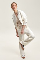 Полочка жакета с двубортной застежкой на петли и пуговицы, вертикальными рельефами и прорезным карманом с клапаном. Горловина V-образной формы, с отложными лацканами и воротником пиджачного типа. Спинка со средним швом и вертикальными рельефами. Рукав длинный, двухшовный, втачной.
