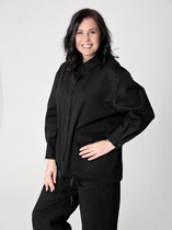 Жакет-бомбер женский прямого силуэта, с притачной манжетой понизу, без подкладки. Горловина округлая с втачной стойкой. По переду центральная застежка на кнопки и наклонные прорезные карманы с листочкой. Рукава длинные втачные, со спущенной линией плеча, понизу - на манжете. Воротник-стойка, манжеты по низу рукава и по низу жакета из трикотажного довяза.