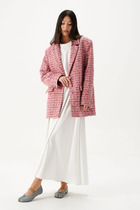 Жакет  женский,    укороченный  на  подкладке.   V образный  вырез  горловины,  остроугольные лацканы.  Застежка  центральная  на  одну  пуговичку.  Рукав  втачной.  Спинка  со средним  швом.  Длина  изделия  39, длина  рукава  61.