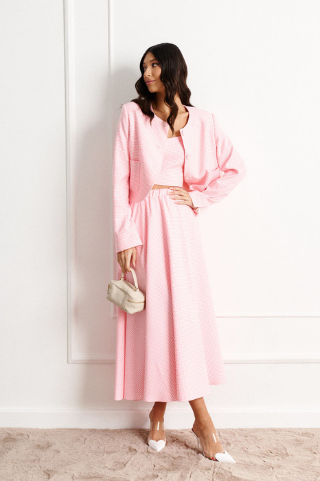 Укороченный жакет выполнен из ткани с принтом бело – розовая клетка.