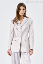 Жакет полуприлегающего силуэта выполнен из костюмной ткани. Характеристики: полуприлегающий силуэт, подплечники, подкладка, остроугольный лацкан, застежка центральная на петли пуговицы, по передней части изделия карманы с клапаном, рукав втачной, по низу рукава нашиты пуговички. Длина по спинке 72 см, длина рукава 76 см