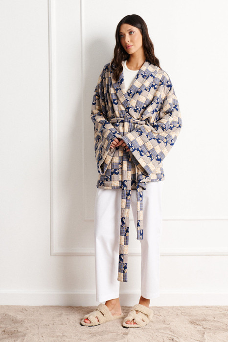 Жакет прямого свободного кроя выполнен из лоскутного полотна. Характеристики: прямой крой , плавные срез горловины, рукав широкий с разведением к низу, по лини тали нашиты шлевки, в комплекте пояс из ткани основного изделия. Длина по спинке 75 , длина рукава 83 от края горловины.