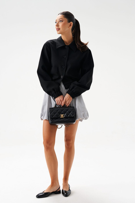 Стильный укороченный жакет выполнен из черной ткани. Укороченный жакет - модный и стильный элемент в гардеробе, который придаст индивидуальность Вашим повседневным образам. Характеристики: укороченный, подкладка, отложной воротник, застежка центральная на пуговички, рукав втачной, по переду прорезные кармашки, низ рукава и низ изделия эластичные на резинке. Длина по спинке от края горловины 48см, длина рукава от края горловины 78см.