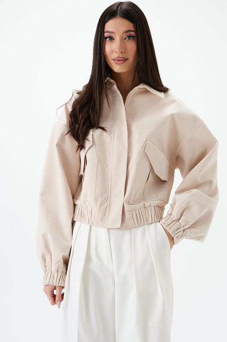 Укороченный жакет выполнен из эко-замши. Характеристики: укороченный, подкладка, отложной воротник, застежка центральная, рукав втачной спущеный, по переду карманы, низ рукава и низ изделия эластичные на резинке. Длина по спинке от края горловины 48см, длина рукава от края горловины 78см