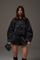 Жакет прямого кроя выполнен из эко-кожи бежевого цвета. Характеристики: прямой крой, брендированная покладка, подплечники, отложной воротник с остроугольным лацканом, застежка центральная на петли пуговицы, по линии талии шлевки, в комплекте пояс из ткани основного изделия, рукав втачной. По линии плеча погон с пуговицей, в среднем шве заднего полотна изделия шлица 17 см. В боковых швах изделия карманы. Длина по спинке 65 см, длина рукава 58 см.