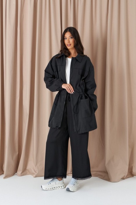 Жакет с акцентной талией выполнен из ткани черного цвета. Характеристики: прямой крой, на поясе и по низу изделия резинки фиксаторы, хлопковая подкладка, отложной воротник, по переду имитация карманов на груди, и накладные карманы ниже талии, застёжка центральная на молнии, отрезная спинка, рукав свободный, по низу рукава резинка. Длина изделия по спинке от края горловины 87 см, длина рукава от края горловины 76 см.