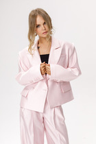 Жакет свободного прямого кроя, выполнен из мягкой фактурной ткани тёмного-бежевого цвета с серебристым напылением. Характеристика: прямой крой, горловина круглая, застежка центральная на петли-пуговицы, рукав втачной спущенный, расширяется к манжету, брендированный подклад. Длина рукава от края горловины 74см. Длина по центру спинки 56 см