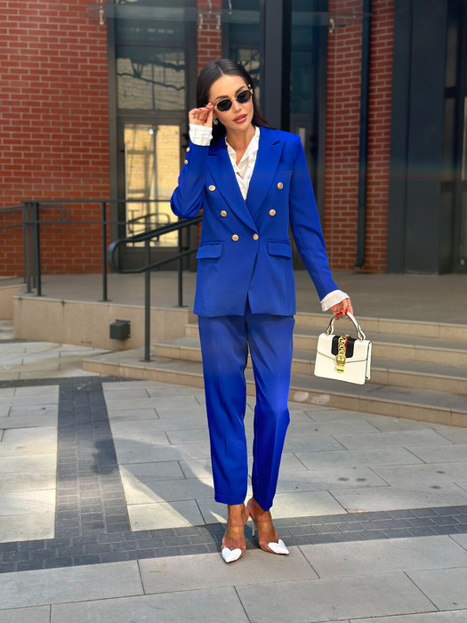 Двубортный жакет на подкладке, прямого силуэта. Обработаны прорезные карманы по переду. Рукава втачные одношовные, обработаны шлицей