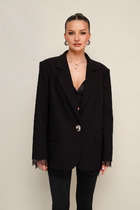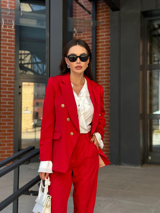 Двубортный жакет на подкладке, прямого силуэта. Обработаны прорезные карманы по переду. Рукава втачные одношовные, обработаны шлицей