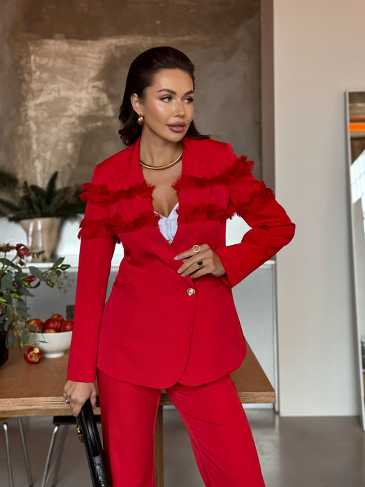 Этот жакет - настоящая жечужина в гардеробе. Небанальный вариант застёжки сбоку на лицевой стороне, и потайной пуговицей внутри изделия придаёт жакету характер, подчёркивает силуэт и линию талии. Жакет выгодно акцентирует фигуру, создавая утончённый и женственный образ. Благодаря декоративным рюшам из вуали, он легко станет центральным элементом образа. Карманы прорезные.
