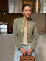 Жакет выполнен из текстильной костюмной ткани в идеальном оливковом цвете. Укороченный крой и застежка на клеванты с пуговицами делают его лучшим акцентом для романтичного или смелого образа. Этот жакет — настоящая жемчужина в гардеробе. Благодаря хорошему крою и пастельной гамме, переплетающейся с золотом он легко станет центральным элементом образа, погоны по плечевым швам добавляют ему объема. Жакет на подкладке, рукава втачные.