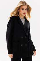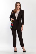 Жакет женский удлиненный, полуприлегающего силуэта с центральной бортовой застежкой на пуговицы до линии перегиба лацкана. Спереди рельефные швы от плечевого шва, отрезной бочок и карман с листочкой. по низу переда настрочен декор. Спинка с рельефами от плечевого шва. Рукав втачной, двухшовный, 3/4, с небольшим разрезом в локтевом шве. Воротник пиджачного типа. Жакет выполнен из х/б ткани, без подкладки. Длина рукава 50, длина по спинке 68 см.