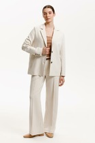 Жакет женский удлиненный, полуприлегающего силуэта с центральной бортовой застежкой на пуговицы до линии перегиба лацкана. Спереди рельефные швы от плечевого шва, отрезной бочок и карман с клапаном. Спинка с рельефами от плечевого шва. Рукав втачной, двухшовный, 3/4, с небольшим разрезом в локтевом шве. Воротник пиджачного типа. Перед жакета на подкладке. Длина рукава 50, длина по спинке 68 см.