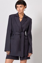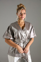 Жакет женский удлиненный, полуприлегающего силуэта с центральной бортовой застежкой на пуговицы до линии перегиба лацкана. Спереди рельефные швы от плечевого шва, отрезной бочок и карман с клапаном. Спинка с рельефами от плечевого шва. Рукав втачной, двухшовный, 3/4, с небольшим разрезом в локтевом шве. Воротник пиджачного типа. Перед жакета на подкладке. Длина рукава 50, длина по спинке 68 см.