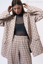 Жакет удлиненный, из текстильной ткани, полуприлегающего силуэта с центральной бортовой застежкой на пуговицы до линии перегиба лацкана. Спереди рельефные швы от плечевого шва, отрезной бочок и карман с клапаном. Спинка с рельефами от плечевого шва. Рукав втачной, двухшовный, по низу рукава шлица на петли-пуговицы. Воротник пиджачного типа. Жакет на подкладке, длина по спинке 67 см, длина рукава 62 см.