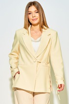Жакет, укороченный прямого силуэта, двубортное с втачным двухшовным рукавом. Полочка с застежкой на петлю-пуговицу и имитацией кармана с клапаном. Спинка с центральным швом. Жакет с отрезным бочком, переходящим на полочку и на спинку. Воротник пиджачного типа с отрезной стойкой. Жакет на подкладке.