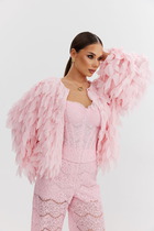 Жакет  женский выполнен в сочетании костюмной ткани и искусственного меха, изделие свободного кроя . На полочке и спинке  изделия расположена контрастная  кокетка, рукав втачной длинный с манжетой по низу, горловина- отложной воротник на стойке.  Застежка петли-пуговицы на планке. низ - фигурный.