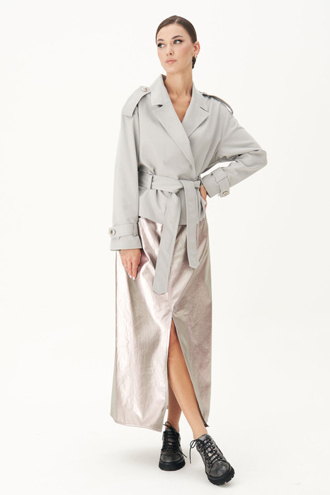 Свободный силуэт, рубашечный покрой, классический английский воротник, смещенный борт без застежки. По линии талии фиксирующий пояс шлёвки. По плечевым швам и низам рукавов - отделочные паты .