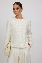 Жакет с центральной застежкой на петли и пуговицы, втачным воротником и лацканом пиджачного типа. По переду с рельефами, выходящими из проймы и нагрудными вытачками. В рельефных швах расположены карманы. По спинке с рельефами, выходящими из проймы. Центральная часть спинки с вышивкой в тон основной ткани. Рукав втачной, длинный.